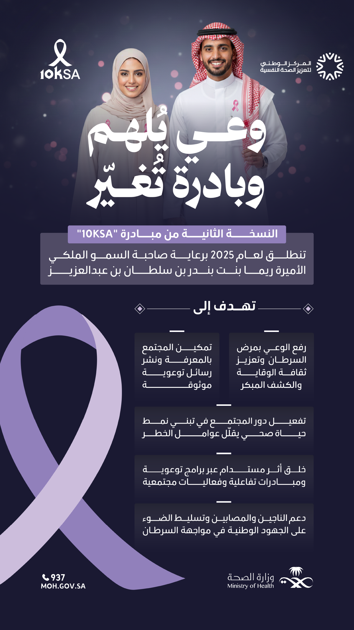 تعزيزًا للوعي المجتمعي: “المركز ” شارك في حملة KSA10 تحت شعر "معًا لأجل الصحة" التي أُطلقت برعاية من صاحبة السمو الملكي الأميرة ريما بنت بندر بن سلطان بن عبدالعزيز آل سعود، والتي تهدف إلى رفع الوعي بمرض السرطان وتعزيز ثقافة الوقاية والكشف المبكر لدى أفراد المجتمع. كما ترتكز الحملة على تمكين المجتمع بالمعرفة، ونشر الرسائل التوعوية الموثوقة، وتفعيل دور المجتمع في تبني نمط حياة صحي بعيد من عوامل الخطورة. وتسعى الحملة إلى خلق تأثير مستدام عبر برامج توعوية ومبادرات تفاعلية وفعاليات مجتمعية، لإبراز أهمية الوقاية، ودعم المصابات والناجيات، وتسلط الضوء على الجهود الوطنية في مواجهة السرطان. وتأتي هذه المشاركة ضمن دور المركز في تقديم التوعية وفق معايير عالمية، بما يتوافق مع قيم المجتمع السعودي وأهداف رؤية المملكة 2030 في بناء مجتمع واعٍ وصحي.