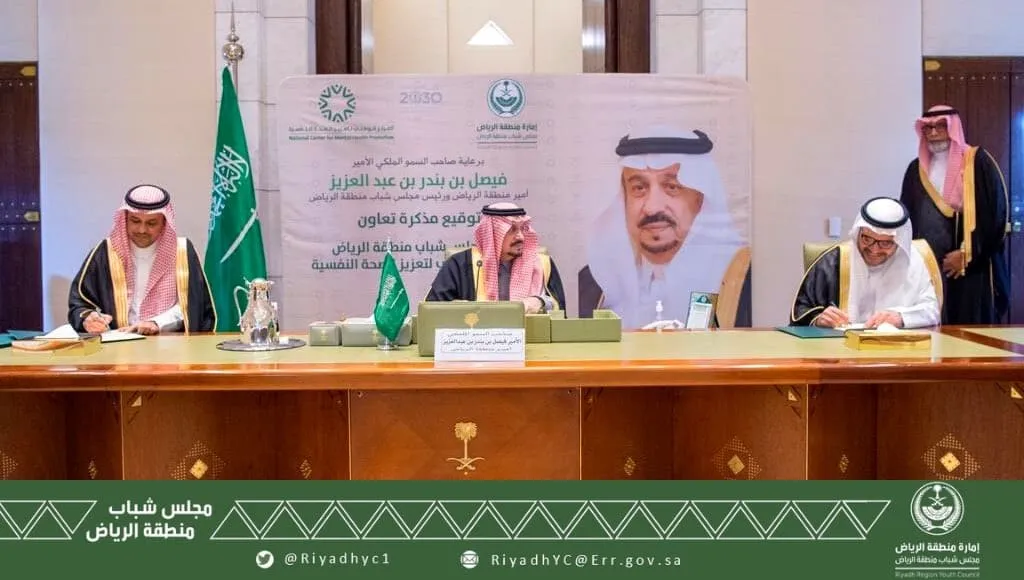 برعاية صاحب السمو الملكي الأمير فيصل بن بندر بن عبدالعزيز أمير منطقة الرياض وقع المركز الوطني لتعزيز الصحة النفسية اتفاقية تعاون مع مجلس الشباب بمنطقة الرياض وذلك في مقر قصر الحكم.
