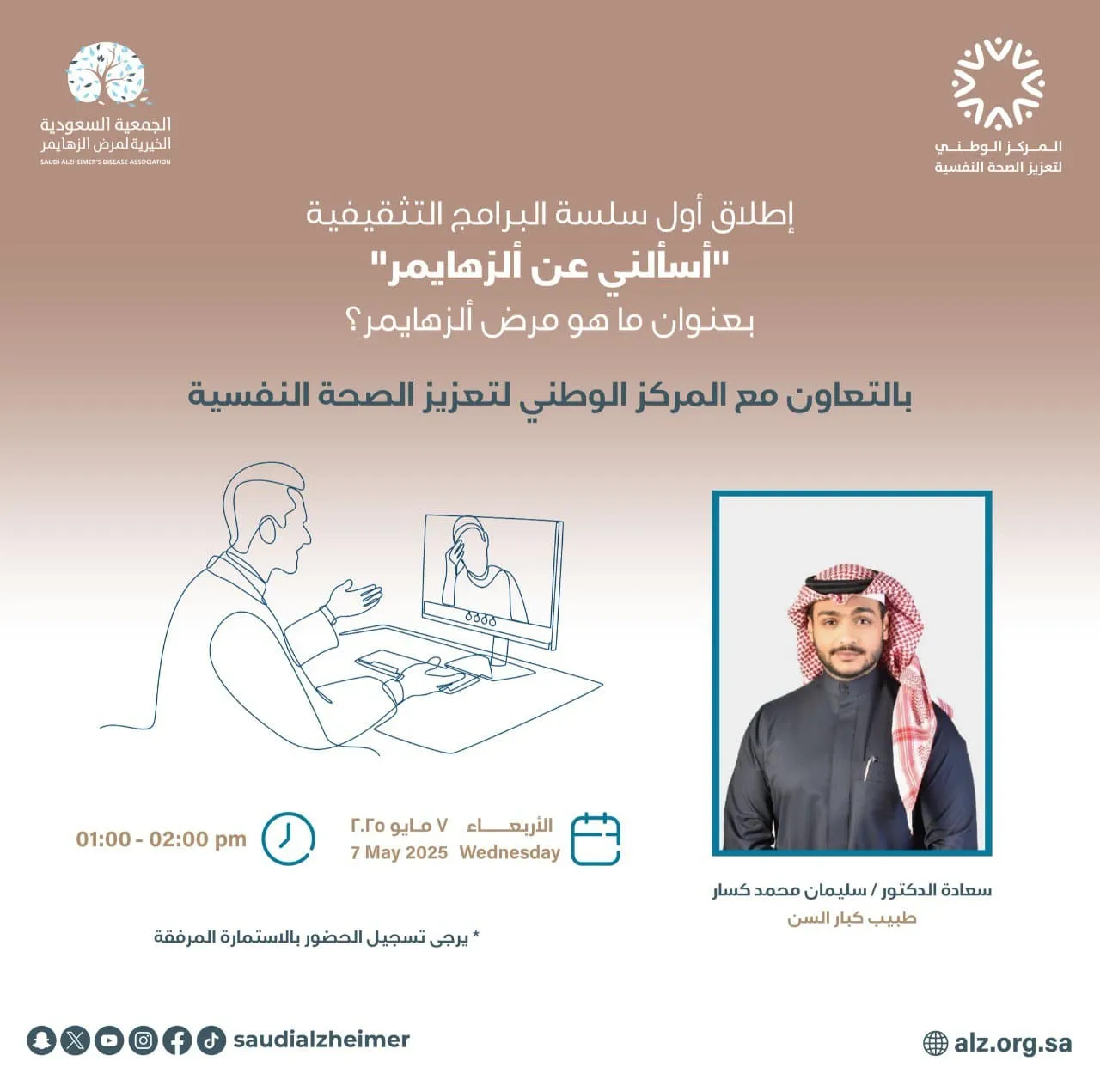 في إطار التعاون المشترك بين المركز الوطني لتعزيز الصحة النفسية والجمعية السعودية لمرضى الزهايمر، نُظمت محاضرة توعوية بعنوان "اسألني عن الزهايمر"، قدّمها الدكتور سليمان كسار، وذلك بحضور عدد من منسوبي المركز.